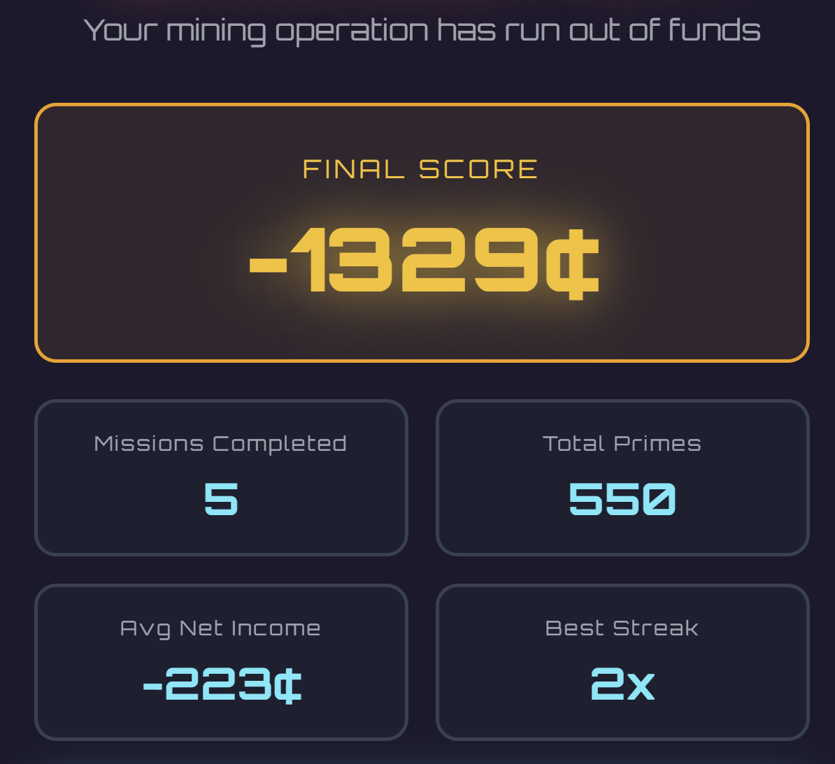Switch between COLLECT mode (gather primes) and COMBAT mode (destroy composites) while managing your mining operation's finances. Costs inflate 5% per mission. Sell your company at the right time or risk bankruptcy.